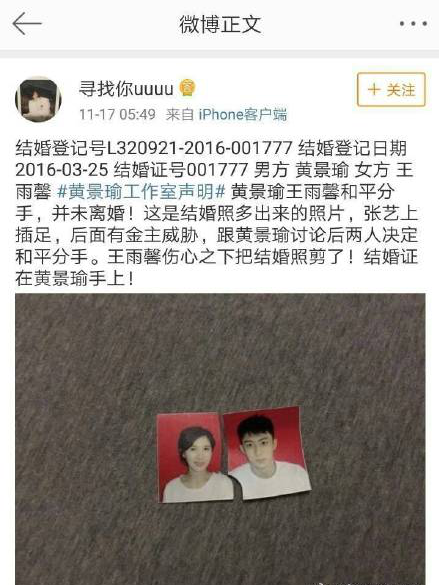 小编: 23日晚,网友晒出疑似黄景瑜和王雨馨的结婚证,喊话“不要乱咬人”,上面的合影和此前被曝出的照片一致。男方工作人员暂未回应。此前黄景瑜被传曾与王雨馨结婚,并因家