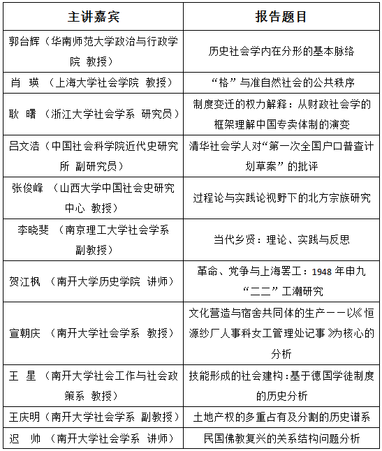 本次工作坊特邀请社会学界和历史学界多位优秀学者进行主题报告,其中多人具有跨学科知识背景。工作坊采用主题演讲与讨论相结合的方法开展,主讲人的报告将提前一周发送给与会者,演讲完毕后与会者直接展开讨论。