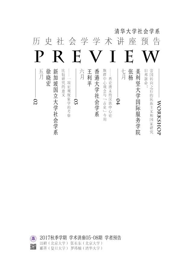 清华大学社会学系历史社会学学术系列讲座,重点关注历史社会学研究的新问题、新方法、新取向。在本学期的五月、六月和七月,我们分别邀请了历史社会学领域的新生力量代表——新加坡国立大学的徐晓宏教授、香港大学的王利平教授、美利坚大学的张杨教授,来分享他们最新的历史社会学研究。