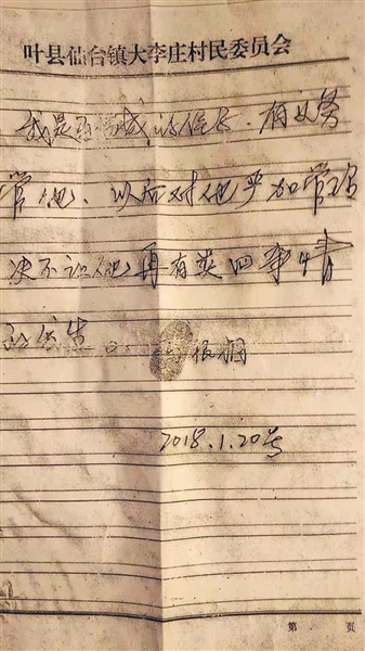 小编: 马留成遇害前一次掘徐家父母的坟被徐家人当场抓到,在当地村支书的见证下,其监护人写下了保证书。受访者供图 2018年1月至3月,三个月内,河南叶县仙台大李庄村徐义明