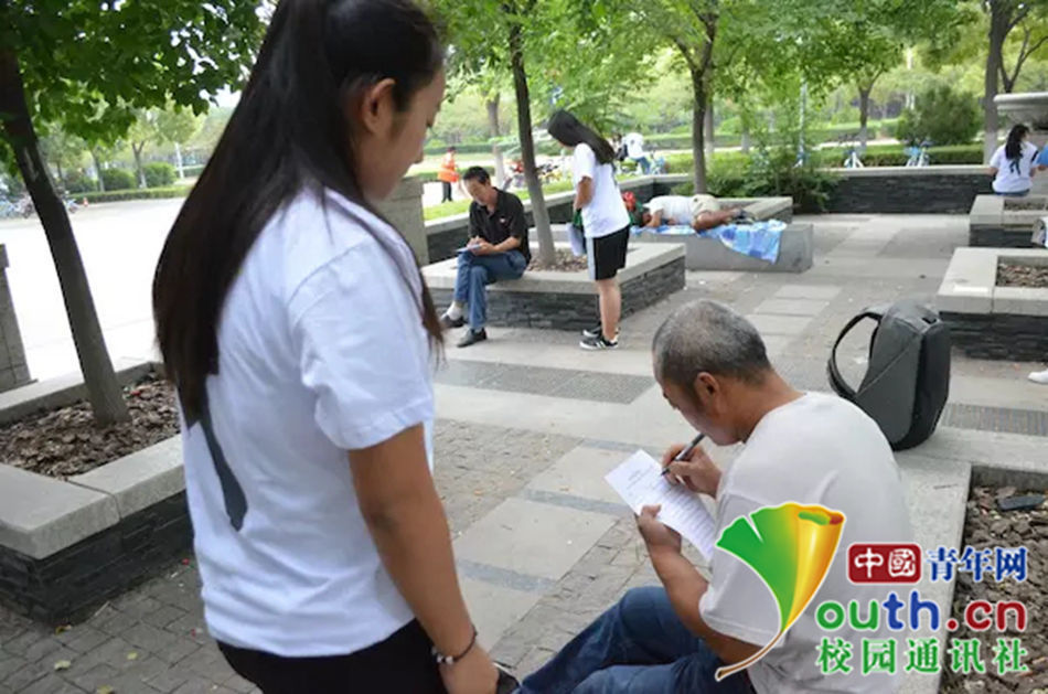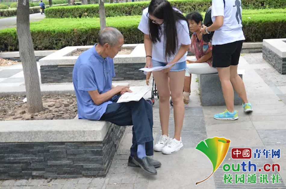 在公园里,年迈的老人正在认真填写我们的调查问卷。中国青年网通讯员 王煜霖 崔文卓 提供