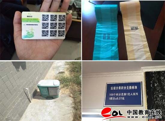 村民家中垃圾分类设施(左上为磁卡、右上为垃圾分类袋、左下为分类垃圾桶、右下为积分兑换标准)