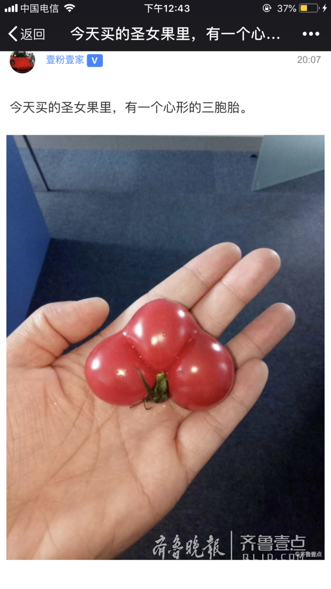 情报员“壹粉壹家”20点07分在齐鲁壹点情报站发来消息:今天买的圣女果里,有一个心形的三胞胎。