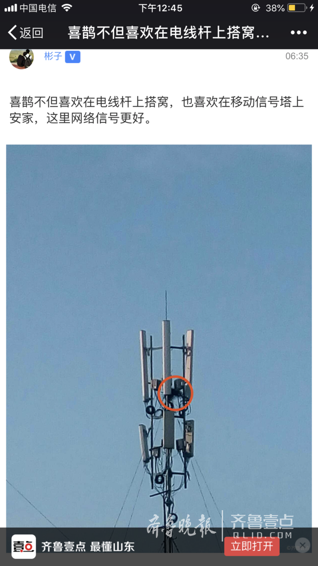 说到辣眼睛,情报员“彬子”6点35分发布消息:喜鹊不但喜欢在电线杆上搭窝,也喜欢在移动信号塔上安家,这里网络信号更好。