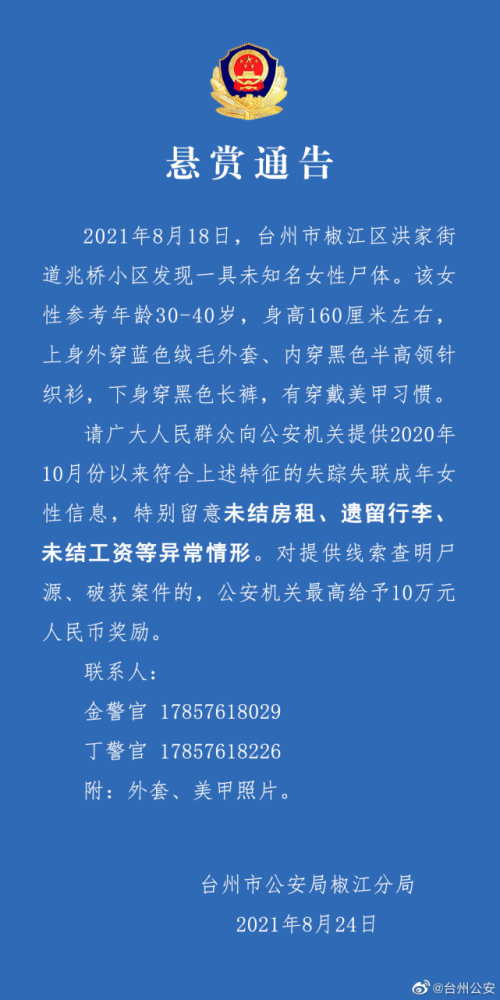 8月19日下午,台州市公安局椒江分局发布一份警情通报,通报称椒江区洪家街道兆桥小区发现一具未知名女尸。警方经过勘查分析,死者为一名成年女性,年龄在40岁以下,身高160厘米左右。警方提醒市民,特别留意近一年来失联、失踪的成年女性,对于查清尸源发挥作用的,公安机关给予5000至20000元的奖励。