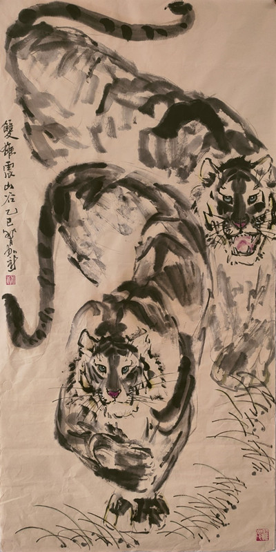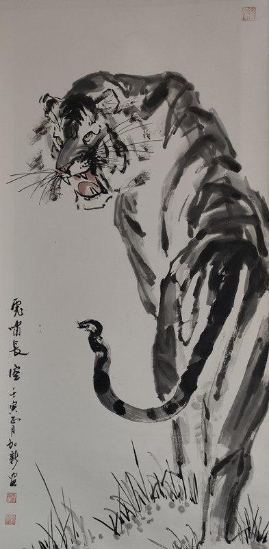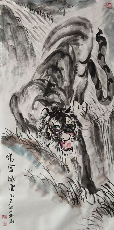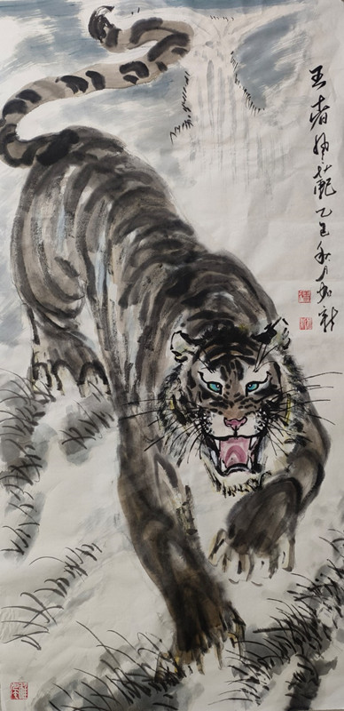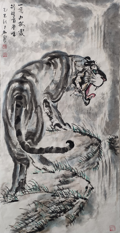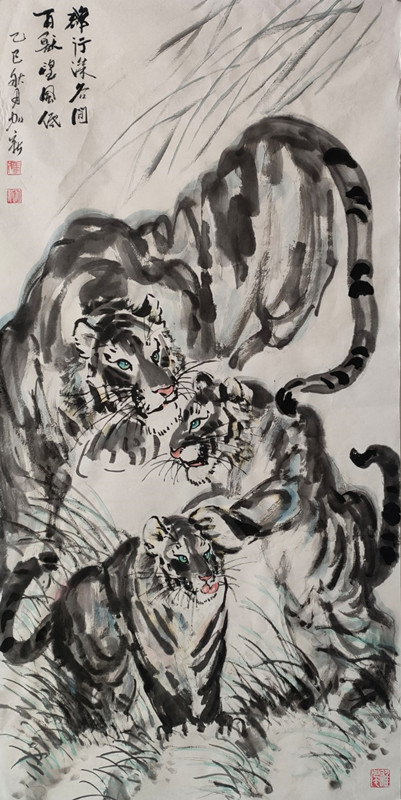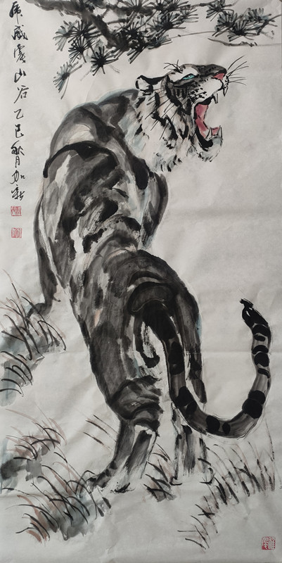 虎为百兽之王,是中华民族精神象征。自古就有“进门堂前先挂虎”之说,是常用来镇宅、安宁、避邪的神灵益兽。加新在年轻时酷爱画虎,20岁时就读于胡运才先生美术学校期间,除了认真临习古今大家山水外,去北京写生、学习时无意中在北京动物园看到真虎,从此将虎的壮美、阳刚、威猛的形象铭记心中,立志把画虎作为一生追求的方向。
