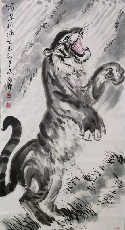 大写意水墨虎画家冯加新画虎,着重表现虎趣、虎的精神,用书写手法作画,笔力苍劲老辣,墨色淋漓雄魂,气韵生动、一气呵成,运用传统笔墨技法勾、皴、擦、泼、破及浓、淡、干、湿、焦等,画出自己极具个性的水墨虎画作品。