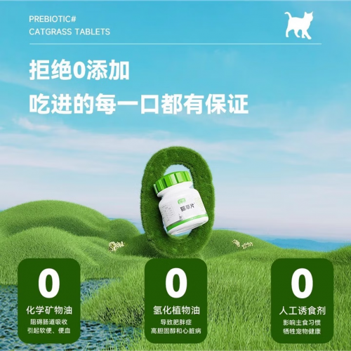 2.成分亮点:依托车前子与大麦草苗提供天然植物膳食纤维,添加果寡糖(益生菌)调节平衡肠道菌群,搭配多种维生素改善猫咪营养性脱毛问题。