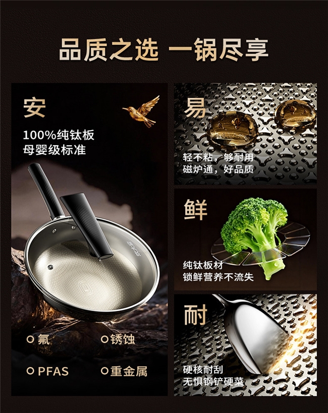 一口好锅,不仅要炒得出锅气,更要守得住健康,这也是炊大皇纯钛锅的核心坚守。市面上不少钛锅只是镀钛、喷钛做表面功夫,而这款纯钛锅真正以钛为魂,食品接触部分无任何化学涂层,实现真0氟0涂层,从根源上杜绝了涂层脱落混入食材的隐患,哪怕长期烹饪重油重味的菜肴,也能吃得安心。同时锅身采用精矩阵纹理,全底真钛实现99%的抗菌率,给厨房加上一层健康防护,为家人的三餐保驾护航。