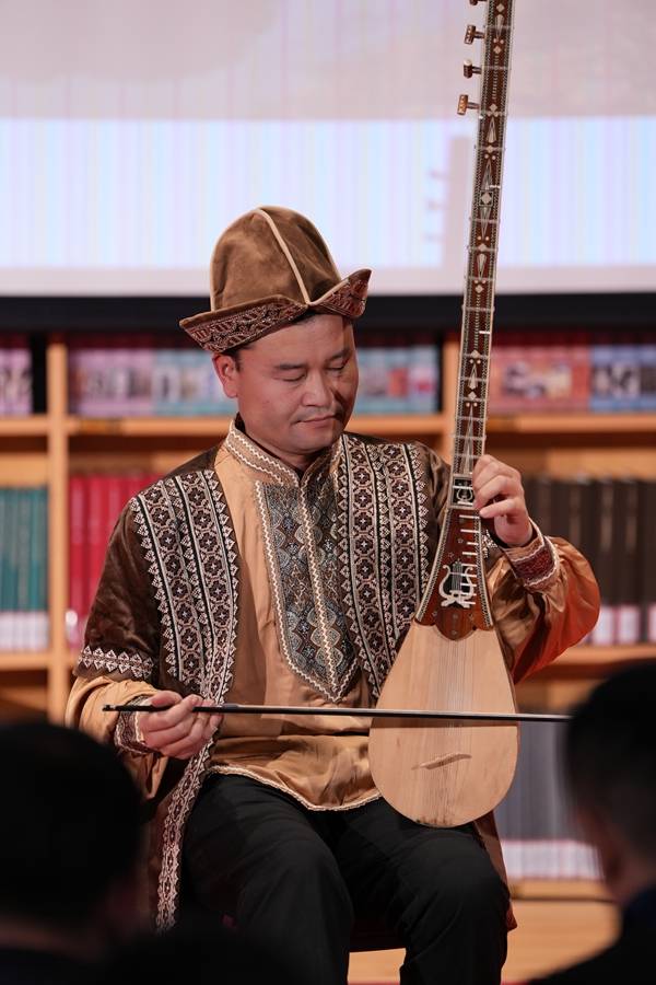 讲唱会上,一位富有传奇色彩的“跨界”典范引发了观众的热烈关注,他就是“全国民族团结进步奖先进个人”、兵团第二师铁门关市民间文艺家协会副主席王心祖。这位原本是口腔医学专家的“兵团二代”,却以半生心血投身于新疆文化遗产的保护与传承事业。王心祖首先为观众介绍了双簧气鸣乐器巴拉曼,还弹奏牧羊人热瓦普演唱了和田民歌《古丽赛迪汗》。紧接着,王心祖、曼苏尔江·艾尼瓦尔和桑布共同演奏了《我的红玫瑰》和《请到铁门关来做客》,马头琴、都塔尔和弹拨尔共同奏出悠扬的旋律,配合上动听的歌声,不仅勾勒出铁门关市的丝路底蕴与生态美景,更传递出边疆人民的热情好客。