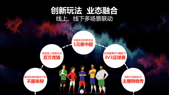 除此之外,业态融合不能少。喜欢踢球的,可以报名参与“狮斗”3V3足球挑战赛;喜欢聊球的,可以参与体育奇葩说节目《不服来辩》;喜欢看球的,中超比赛只要1块钱;喜欢美女帅哥的,来看看体育主播购物秀穿整场;喜欢足球竞猜的,百万猜球奖金等你来拿;喜欢电竞游戏的,《炉石传说》和《星际争霸II》电竞明星同场竞技等你来玩。