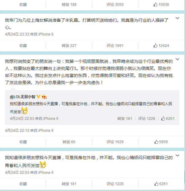 上周,著名LOL游戏主播小智因在直播过程中遭到观众辱骂,情绪失控表示要暂停直播。还表示要休息一段时间。4月22日,小智发布微博,称,“自己叫的大宝舰,含着泪,也要坐完!”从微博内容及照片可以看出小智是乘船出海旅游。随后几天小智又发表了多篇微博,从内容中得知小智是去了上海,并表示:心情烦闷只能挥霍自己的青春和人民币发泄。