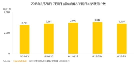 据QuestMobile数据显示,世界杯开赛以来,新浪新闻的周日均活跃用户数增长显著,6月11日-7月1日这三周的周日活均值达到2979万,与月初第一周数据相比,增长超过200万。