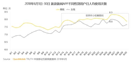 QuestMobile数据也印证了泛球迷的注意力在新浪新闻同样被吸引,6月18日-7月1日期间新浪新闻周日活跃用户均值达到2973.5万。以用户性别划分,男性用户日人均使用次数在世界杯小组赛期间有所增长,峰值达8.3次,较赛前平均增长6.5%;女性用户日人均使用次数也有明显提升,峰值达8次。