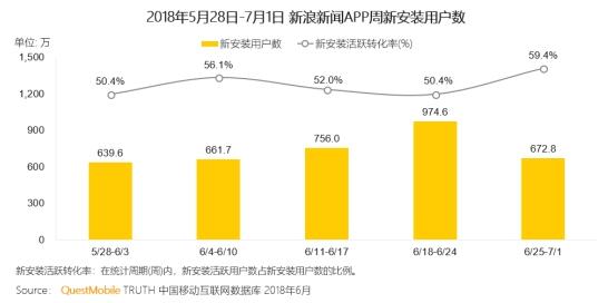 此外,新浪新闻在世界杯期间的新增用户数也有显著提升。数据显示,6月11日-24日世界杯小组赛期间,新浪新闻APP周新安装用户数近千万。同时,新安装活跃转化率稳中有涨,峰值高达59.4%。