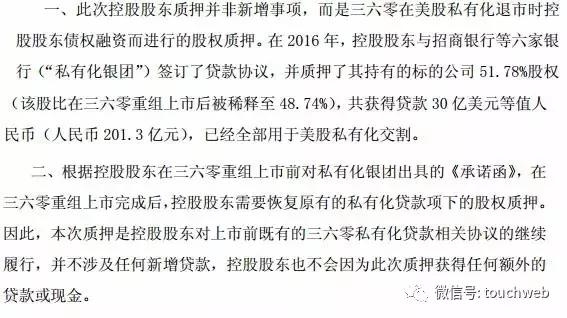 因此,本次质押是控股股东对上市前既有的360私有化贷款相关协议的继续履行,并不涉及任何新增贷款,控股股东也不会因为此次质押获得任何额外的贷款或现金。