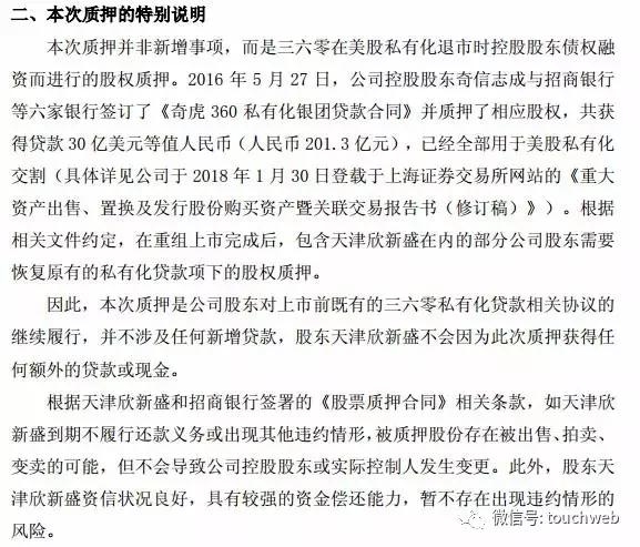 本次质押并非新增事项,而是三六零在美股私有化退市时控股股东债权融资而进行的股权质押。不涉及任何新增贷款,股东天津欣新盛不会因为此次质押获得任何额外的贷款或现金。