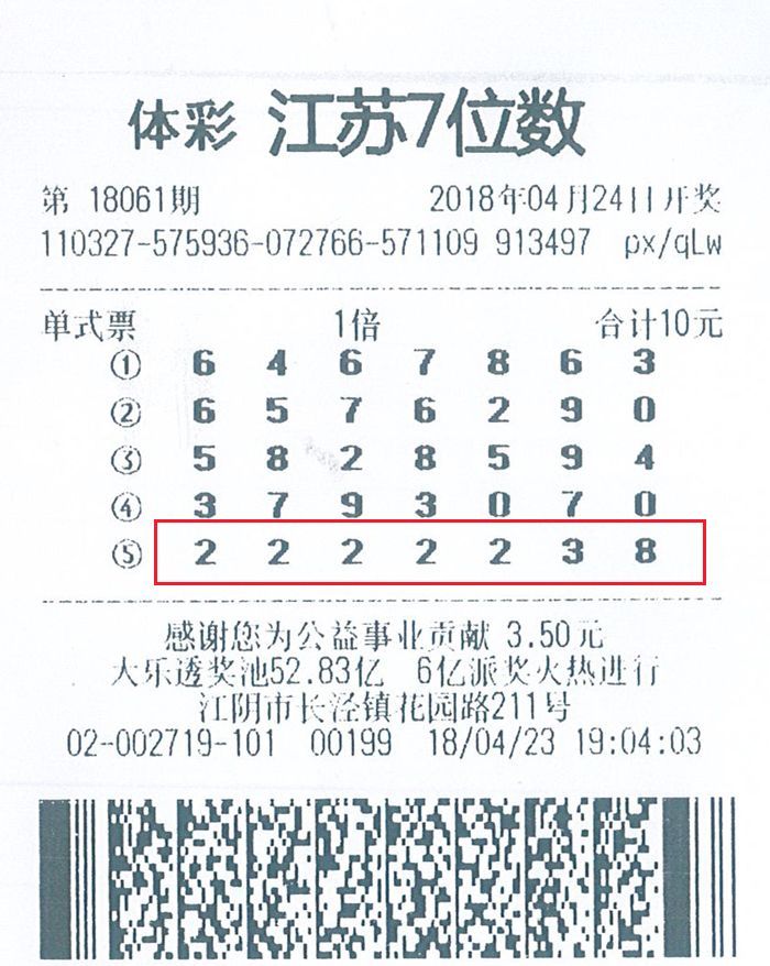 小唐这股不怕“2”的精神,让她收获了惊喜,4月24日晚,江苏体彩7位数玩法18061期开出中奖号码“2222238”,当期中出500万元特等奖1注,正是出自江阴02719网点。
