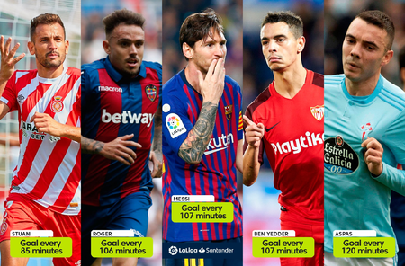 进球效率最高的是斯图亚尼,平均每85分钟就会打入一球,巴塞罗那球星梅西排在第三位,平均每107分钟便有一球进账,同时,包括罗吉尔、本-耶德尔以及阿斯帕斯也在前五名单中。