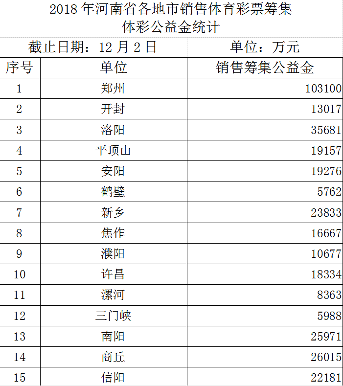 截至12月2日,2018年河南省已销售体育彩票164.28亿元,超过2017年总销量34.6亿元,为社会筹集公益金39.1亿元(其中,用于河南省体育和社会公益事业19.55亿元;用于补充全国社保基金11.73亿元、中央专项彩票基金5.865亿元、国家体育总局和民政部各使用0.9775亿元)。