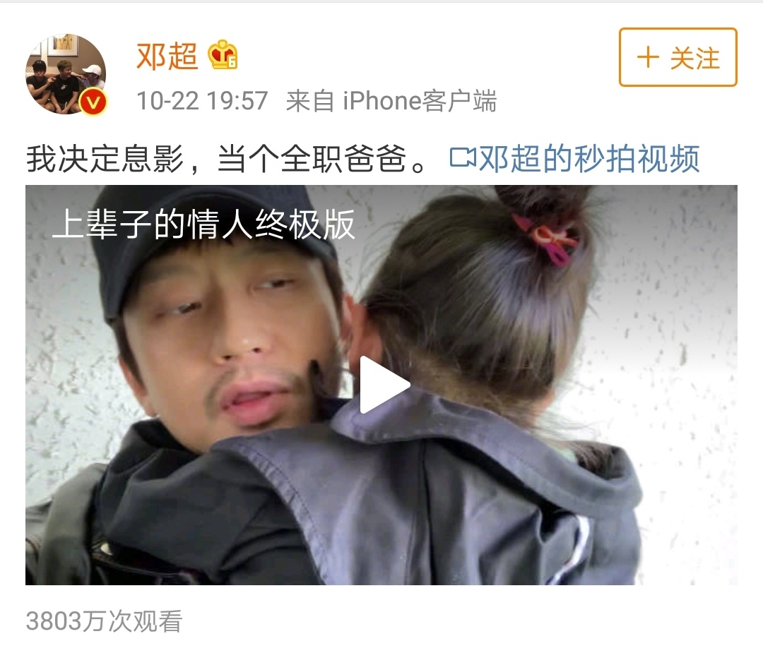 小编: 就在最近几天,邓超发了一条微博视频,并配文:“我决定息影,当个全职爸爸