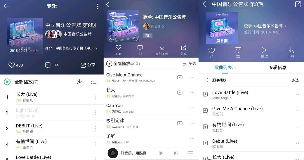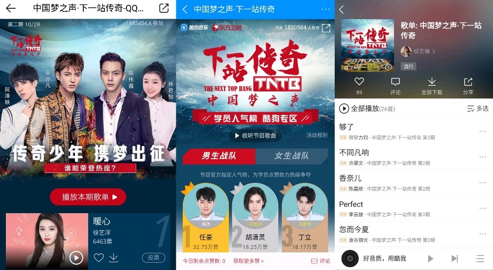 十月渐尽,秋色渐凉,冷空气来袭,听说音乐和chill cool更配哦。这份来自腾讯音乐娱乐的“周末乐报”,网络全网热门综艺金曲歌单,为你带来暖心音乐。在上周,《中国梦之声·下一站传奇》选人亮点频现竞争白热化,女生满员男生仅剩两席;歌手丁当在《梦想的声音》现场“踢馆”;《中国音乐公告牌》第八期群星云集,张艺兴打歌现场引爆高潮,陈立农骑小木马治愈开唱;《蒙面唱将猜猜猜》悬疑升级迷雾重重;更有《中国藏歌会》、《新声有范》、《show me the money 777》等节目精彩唱不停!腾讯音乐娱乐集团旗下QQ音乐、酷狗音乐、酷我音乐三大平台零时差同步收录,一站式收听全网热门综艺歌曲,跟着节奏唱起来~