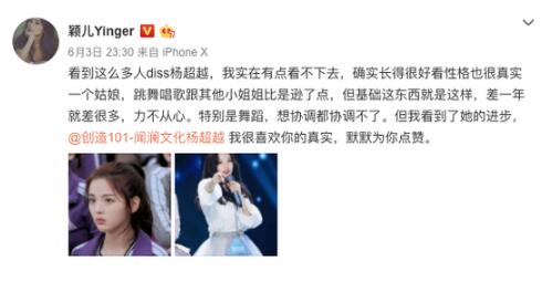 颖儿晒出《创造101》选手杨超越的照片,并配文:“看到这么多人diss杨超越,我实在有点看不下去,确实长得很好看性格也很真实一个姑娘,跳舞唱歌跟其他小姐姐比是逊了点,但基础这东西就是这样,差一年就差很多,力不从心。特别是舞蹈,想协调都协调不了。但我看到了她的进步,我很喜欢你的真实,默默为你点赞。”