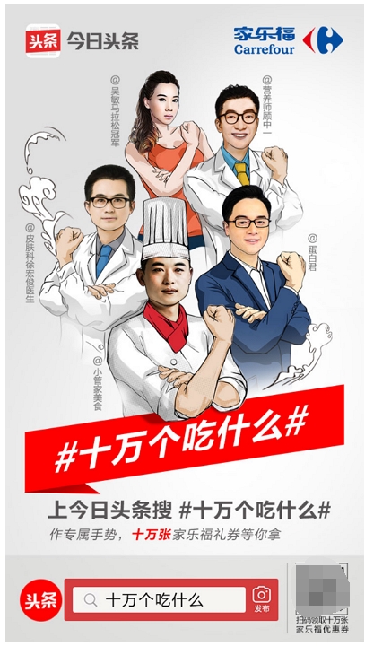 近日,今日头条联合家乐福开展了一场大规模的跨界品牌市场合作活动,引起广泛影响。线上,今日头条发起#十万个吃什么#超级话题活动,成立美食研究社,邀请五位今日头条知名吃货研究员,他们分别来自美食、营养、健康、生活等领域@小管家美食、@蛋白君、@皮肤科徐宏俊医生、@营养师顾中一 以及@吴敏马拉松冠军,为网友们推荐量身定做的美食方案。网友可通过发布美食相关的微头条或小视频参与活动赢取专属大礼;线家家乐福门店共同参与此次活动并为网友们送出十万张礼券和千元福卡。
