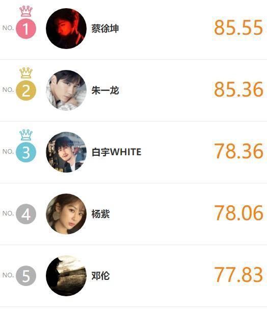 纵观下来,大家关注度很高的第一名是蔡徐坤,他也是在偶像练习生中获得超高人气的新艺人,唱跳实力俱佳的他赢得了很多迷妹的心,而且他的粉丝也是十分给力的,所以能够得到榜首的位置就该知道他有多么受欢迎了。其次第二名和第三是我们的镇魂兄弟朱一龙白宇,他们终于相聚齐上榜了。想必大家喜欢他俩都是因为看了镇魂这不热剧,这对好兄弟私底下也是很暖心,能够让很多女孩成为他们兄弟俩的镇魂女孩,也足以能看出两人的魅力值了。