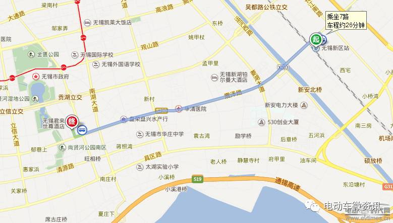 无锡新区站出来步行270米至城铁新区站(珠江路)乘坐7路车,9站以后再无锡国际博览中心东站下车,接着步行560米。