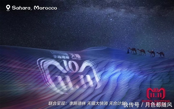 李施德林在摩洛哥撒哈拉沙漠的全息投影让一支骆驼队漫步在最美沙漠星空,天猫双11 logo空降星空之城。