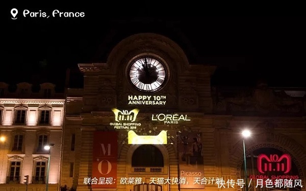 欧莱雅在巴黎的灯光秀让品牌、天猫双11十周年logo与欧洲最美博物馆“奥赛博物馆同框,意境满满。