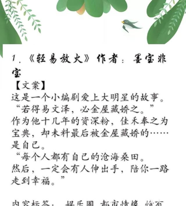 若得易文泽,必金屋藏之。男主是演员女主编剧,女主是男主几十年的粉丝,后来终于在片场结识了男神并扑倒男神的一个故事。作者墨宝非宝,是一个非常擅长写暖心的小故事的大大,文风一般都是偏甜,喜欢的小可爱可以继续看看她的其他作品。